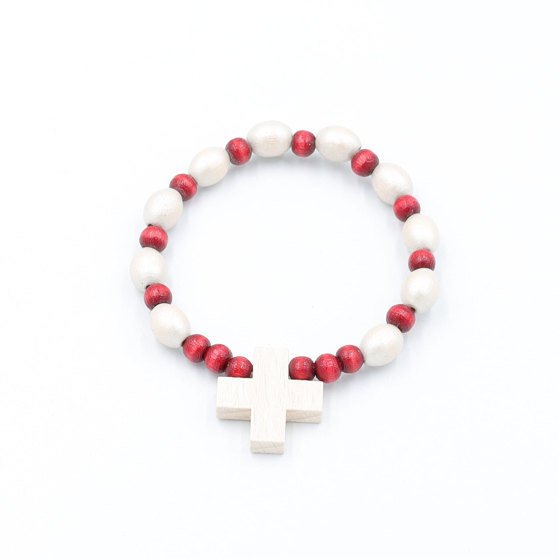 Bransoletka drewniana na gumce jubilerskiej - biały/czerwony 2
