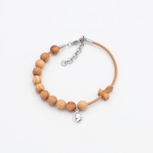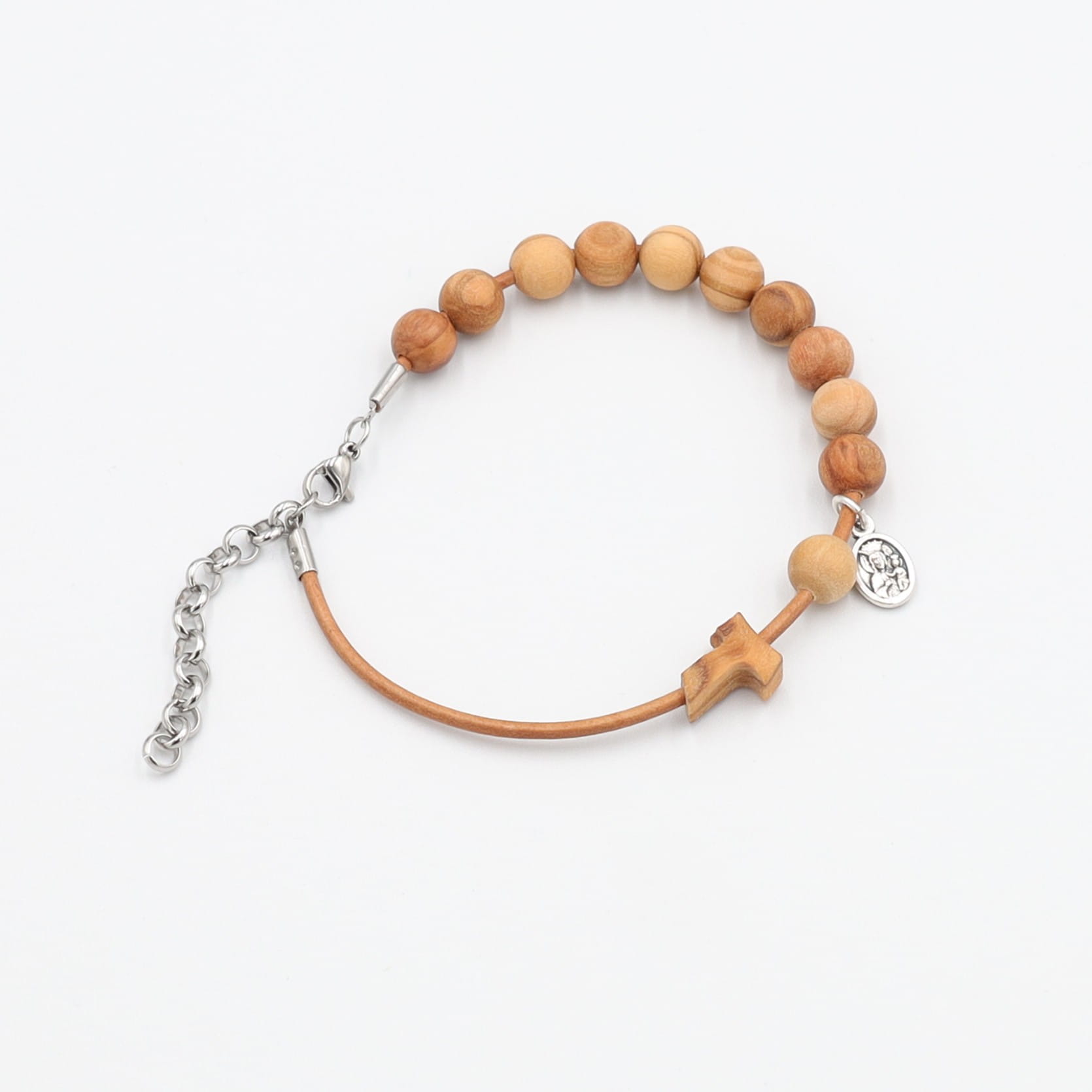 Bransoletka drewno oliwne 8 mm + rzemień skórzany+stal chirurgiczna