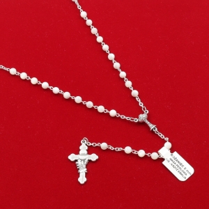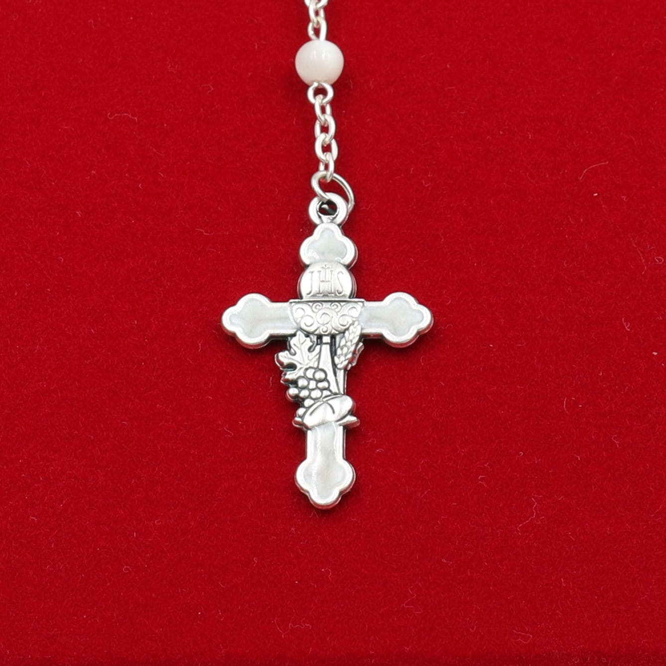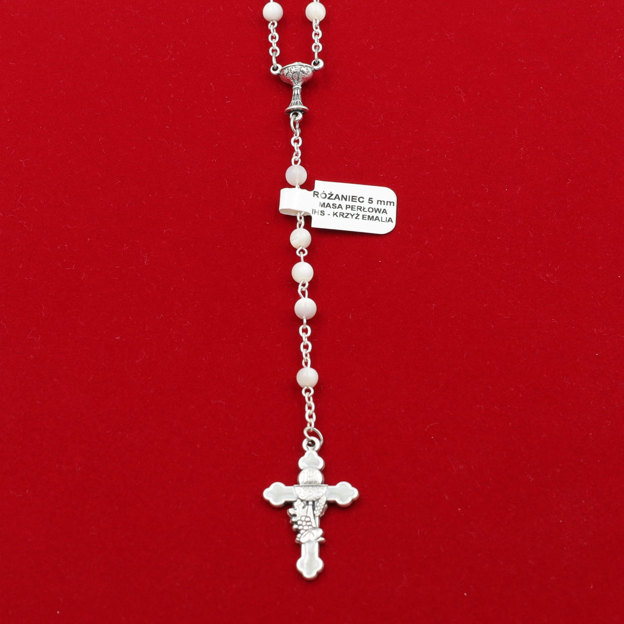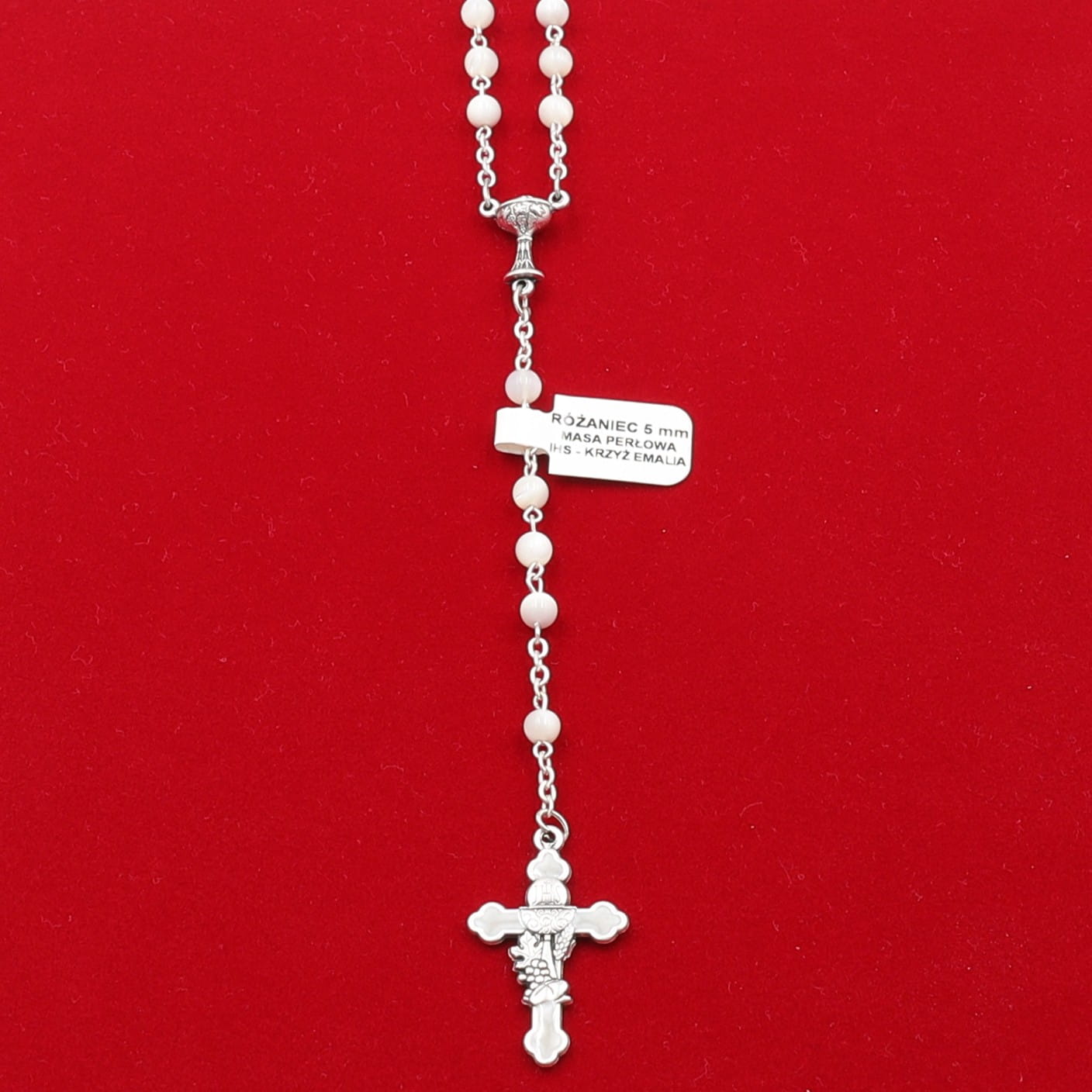 Różaniec masa perłowa 5 mm IHS - krzyż emalia