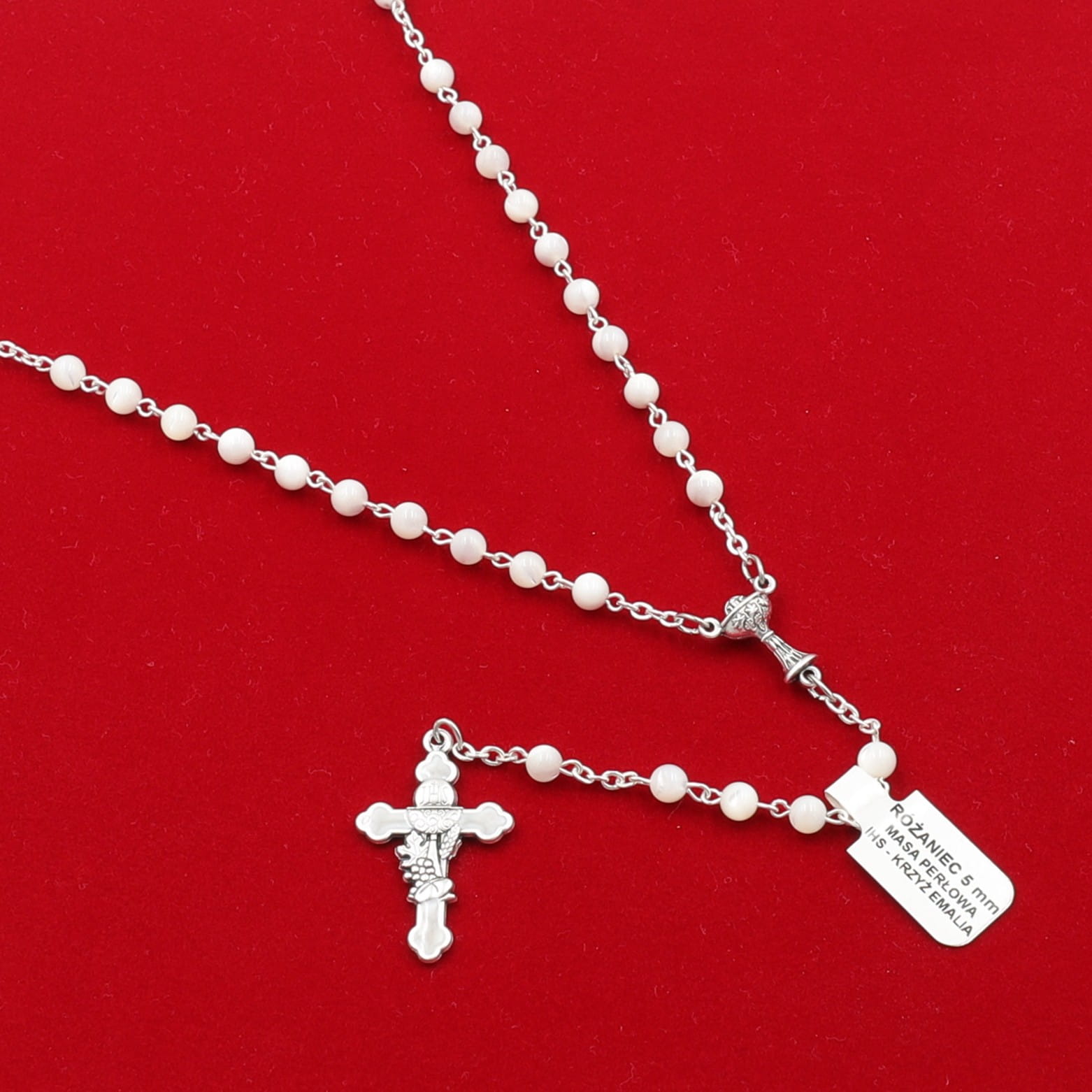 - Różaniec wykonany z masy perłowej w rozmiarze 5 mm