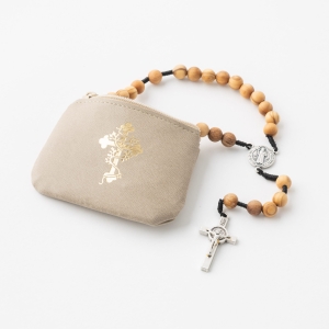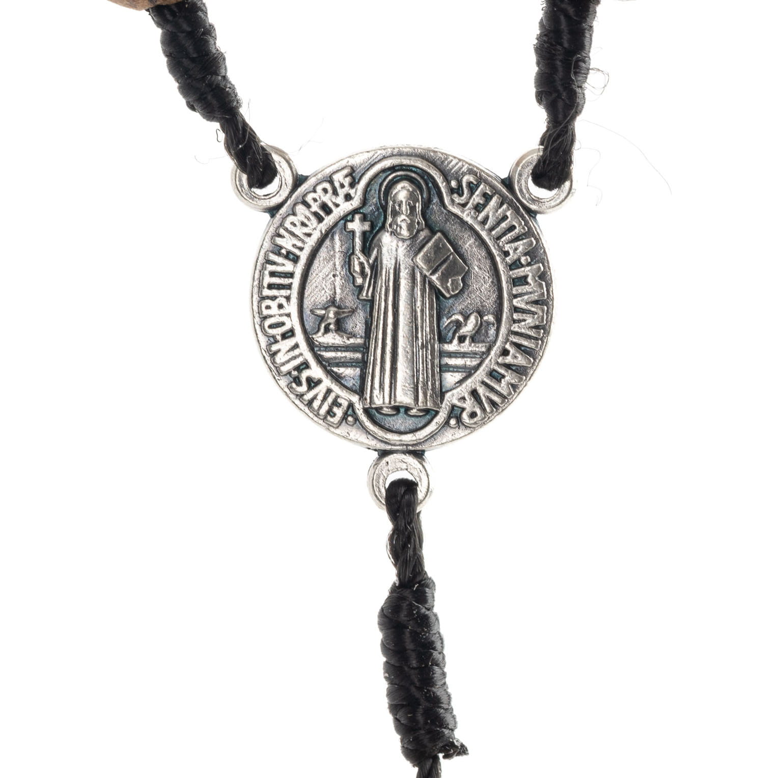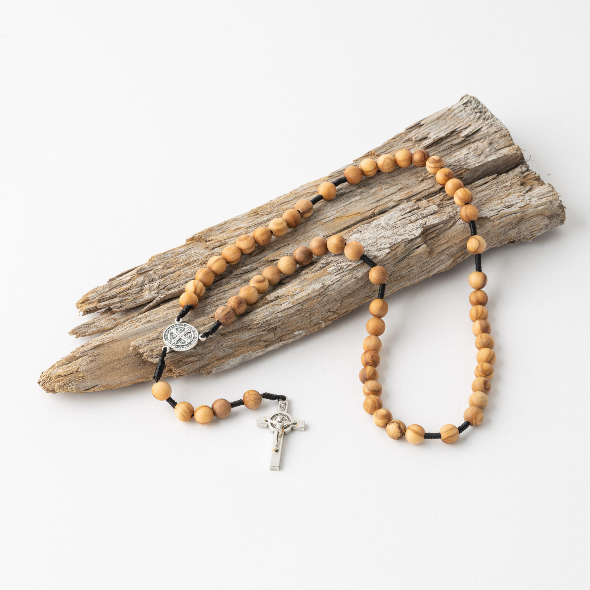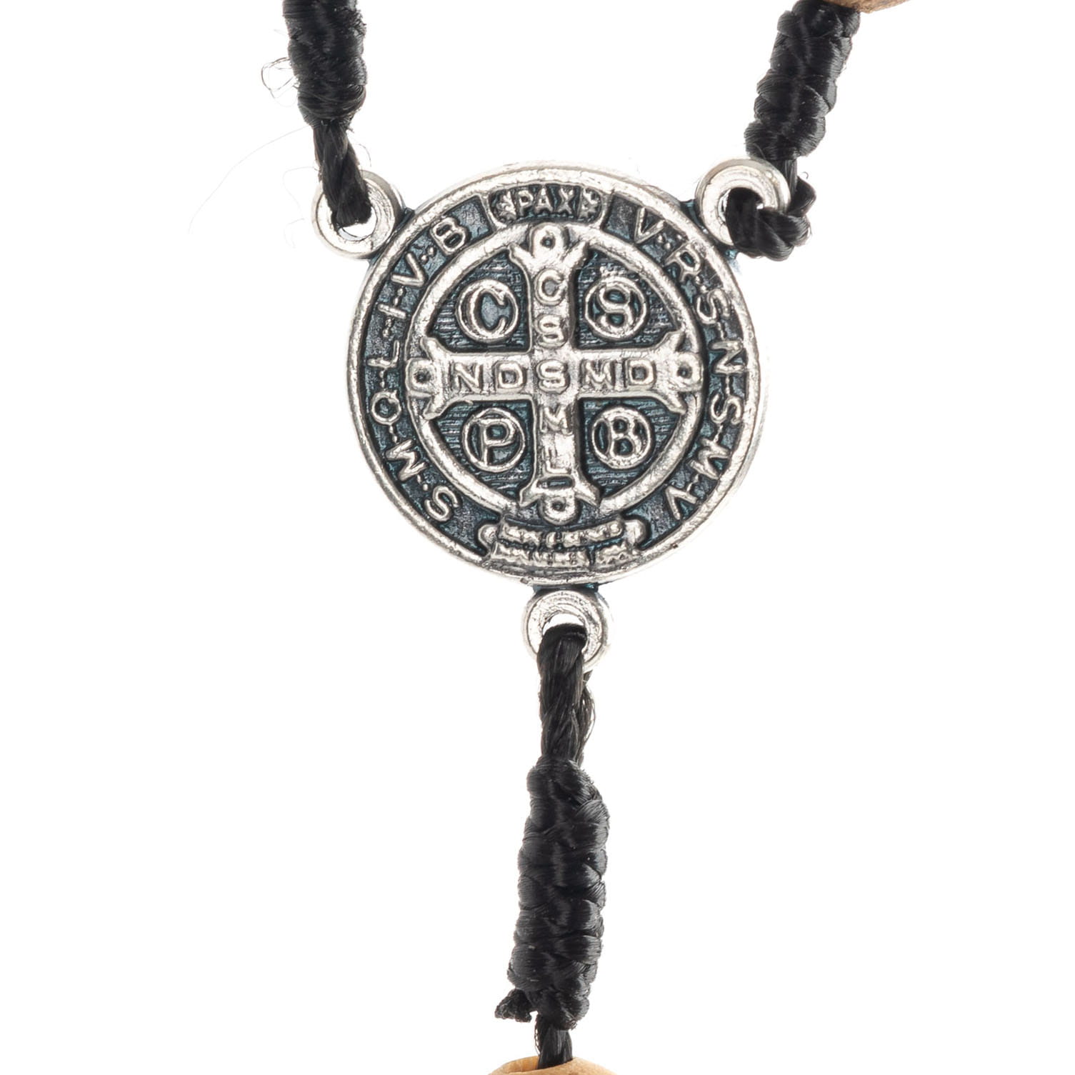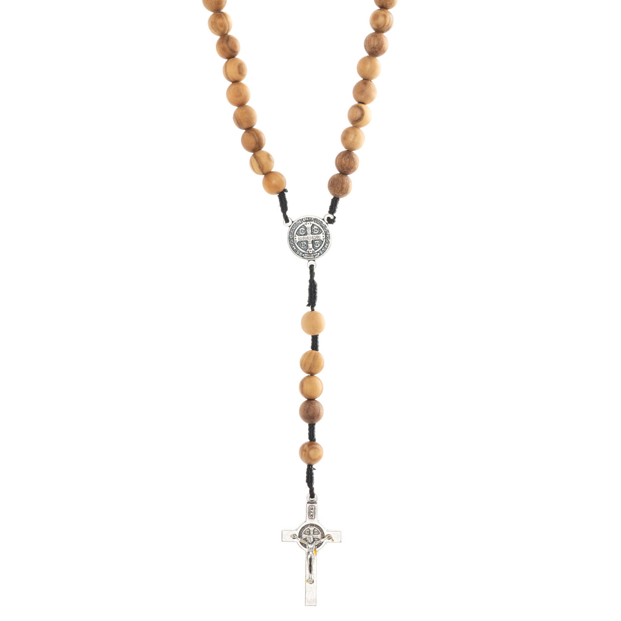Różaniec z drewna oliwnego 8 mm na sznurku - Krzyż i łącznik Św. Benedykt
